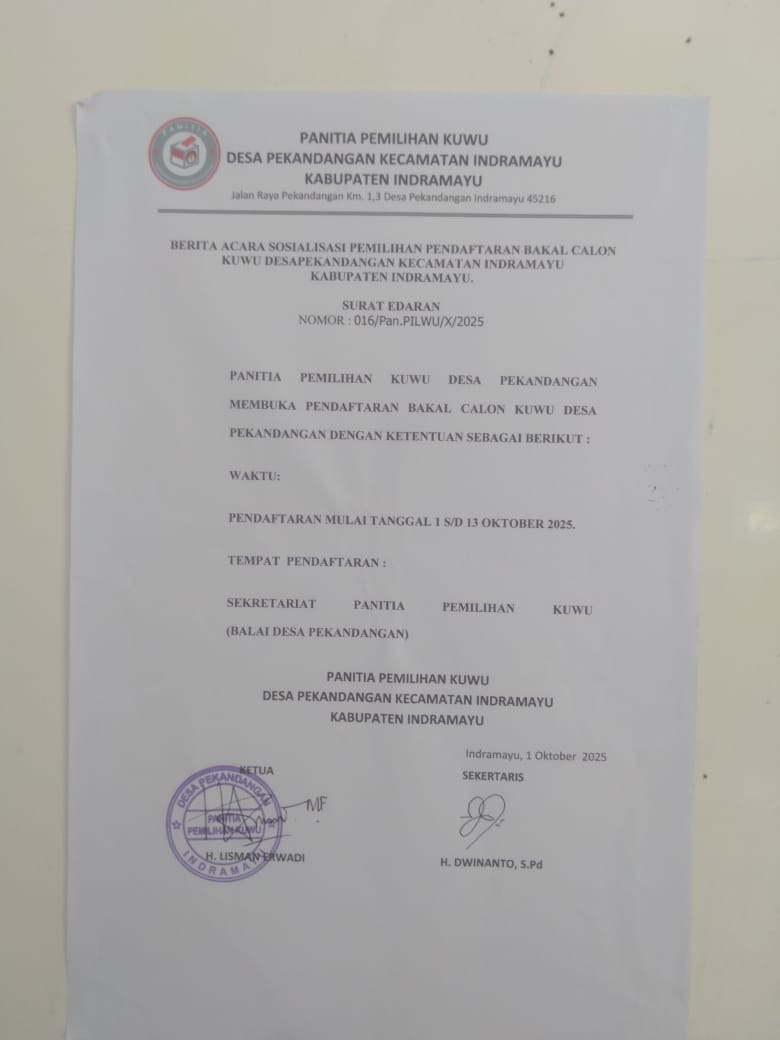 Ada 5 Bakal Calon Kuwu (Bacawu) atau Bakal Calon Kepala Desa Pekandangan yang telah resmi mendaftar sebagai peserta Pemilihan Kuwu (Pilwu) serentak di Kabupaten Indramayu, Jawa Barat, pada 10 Desember tahun 2025 ini.