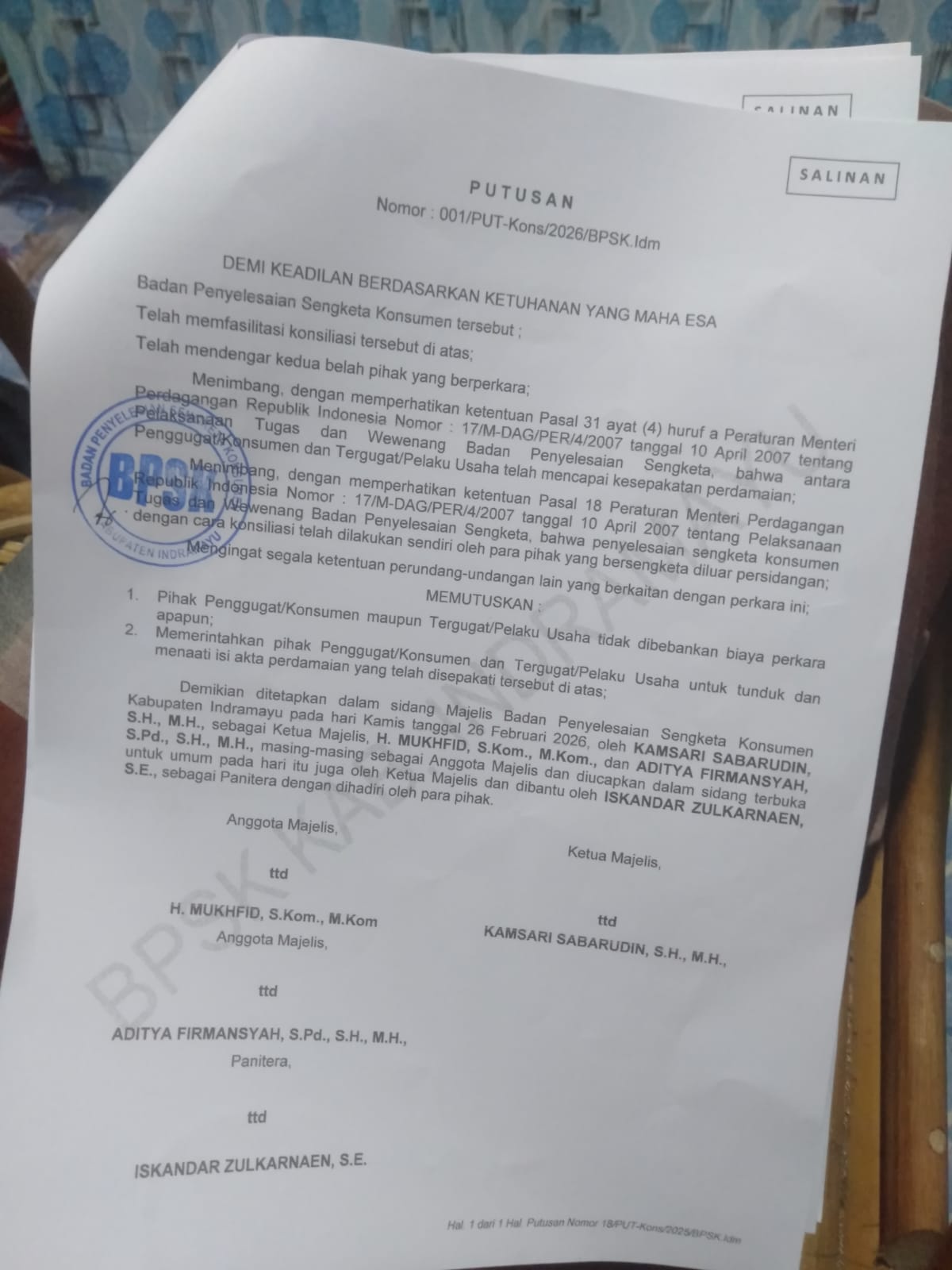 Demikian ditetapkan dalam sidang majelis BPSK Indramayu pada hari Kamis, 26 Februari 2026 oleh Kamsari Sabarudin, SH, MH sebagai ketua majelis H. Mukhfid, S.Kom, M.Kom dan Aditya Firmansyah, S.Pd, SH, MH, masing-masing sebagai anggota majelis dan diucapkan dalam sidang terbuka untuk umum, pada hari itu juga oleh ketua majelis dan dibantu oleh Iskandar Zulkarnaen, SE sebagai panitera dengan dihadiri oleh para pihak. (S Tarigan)