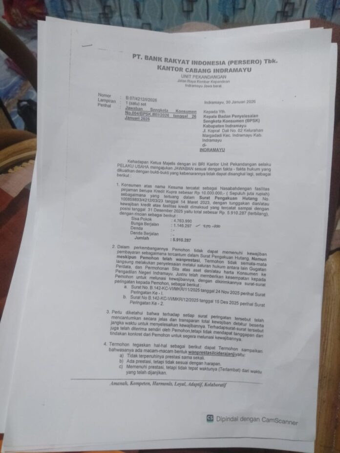 Bank Rakyat Indonesia alias BRI Unit Pekandangan, Indramayu, Jawa Barat, dilaporkan nasabahnya ke Badan Penyelesaian Sengketa Konsumen (BPSK) Indramayu di Jalan Kopral Dali No. 02, Kelurahan Margadadi, Indramayu, Jawa Barat. Surat tanda bukti laporan pengaduan dengan nomor 001/BPSK.IM/1/2026 tersebut tertanggal 22 Januari 2026, atas nama pelapor inisial KSM (31) warga Desa Pekandangan.