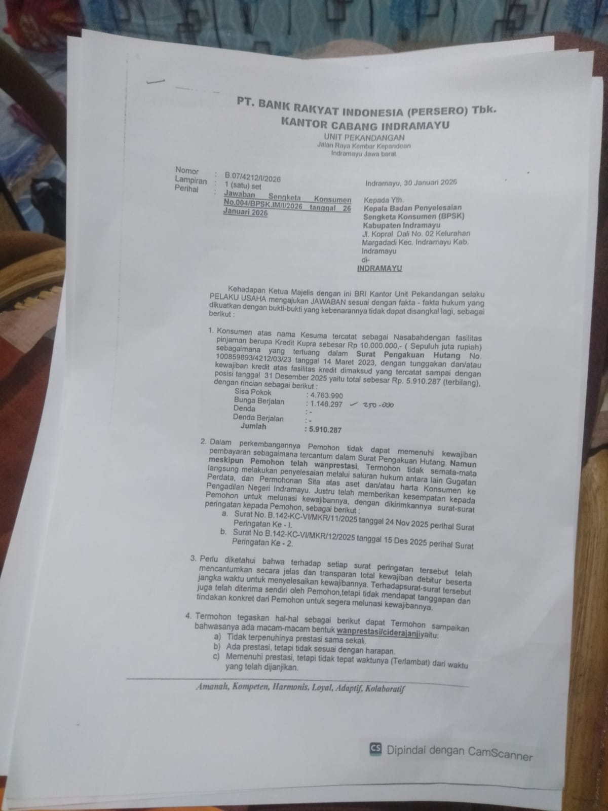 Dari uraian panjang versi BRI, bahwa penggugat (konsumen), tercatat sebagai nasabah kredit Kupra sebesar Rp10.000.000 dengan tunggakan senilai Rp5.910.287 dengan rincian: (a) Sisa pokok Rp4.763.990, (b) bunga berjalan Rp1.146.297 yang pada pokoknya di poin 9, BRI sebagai termohon, mohon dengan segala hormat kepada yang mulia majelis hakim pada BPSK Indramayu yang memeriksa dan mengadili perkara ini, untuk memutus menolak gugatan pemohon untuk seluruhnya. Surat jawaban BRI tersebut ditandatangani oleh Uly Nisa Azmi sebagai Kepala Unit.