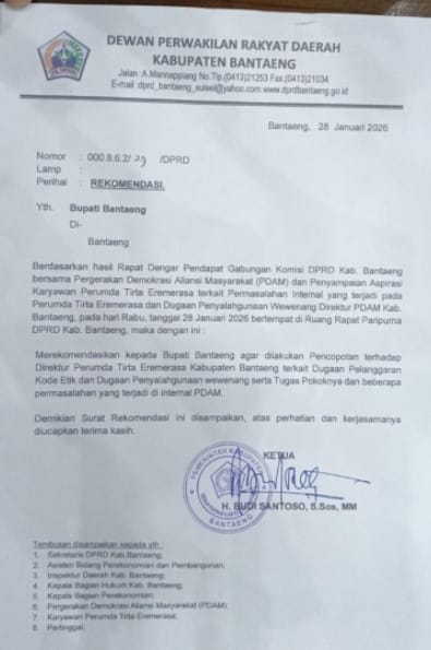Dewan Perwakilan Rakyat Daerah (DPRD) Kabupaten Bantaeng secara resmi merekomendasikan pencopotan Direktur Perumda Tirta Eremerasa kepada Bupati Bantaeng. Rekomendasi tersebut tertuang dalam surat resmi DPRD Bantaeng tertanggal 28 Januari 2026.