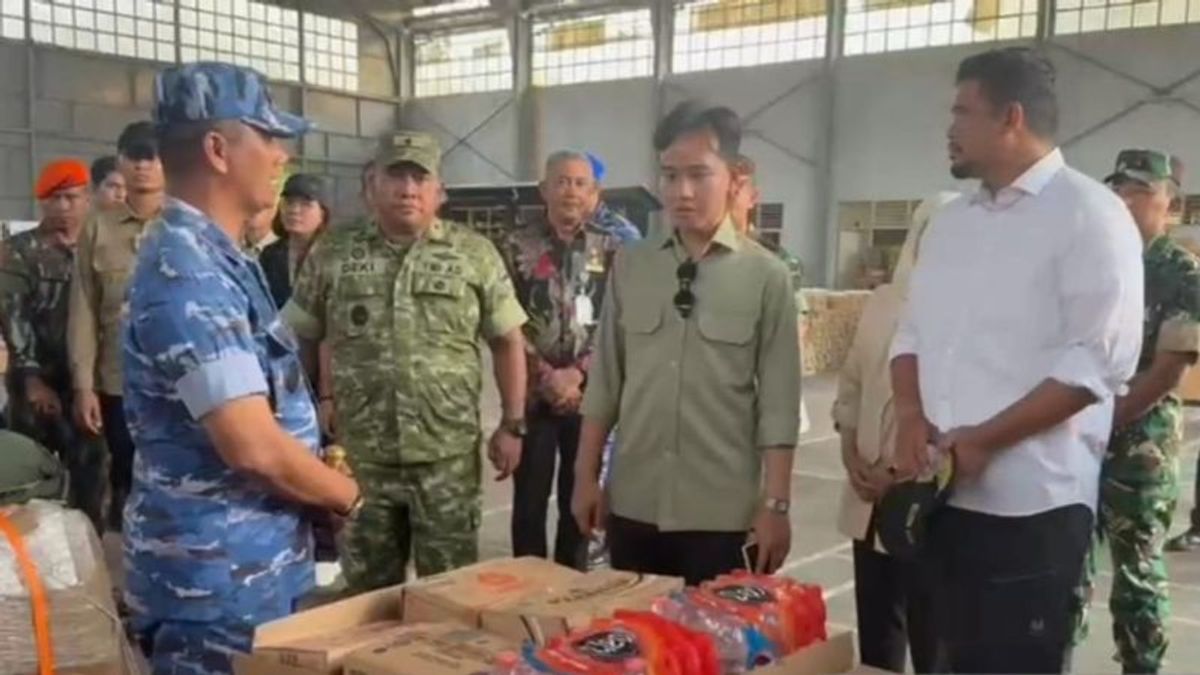 Wakil Presiden Gibran Rakabuming Raka didampingi Gubernur Sumatera Utara Bobby Nasution meninjau dan memeriksa stok bantuan pangan di gudang logistik yang berada di Pangkalan Udara TNI AU Soewondo, Medan.
