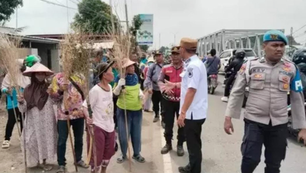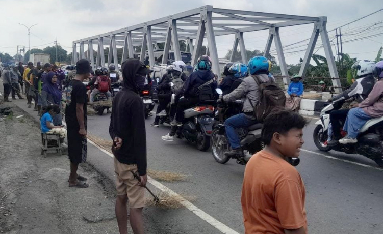 Pantauan awak media, puluhan warga terlihat berjajar di sepanjang bahu jalan sambil membawa sapu dari ranting pohon. Saat pengendara melintas dan melemparkan uang koin, mereka langsung berlari ke tengah jalan untuk berebut koin tersebut.