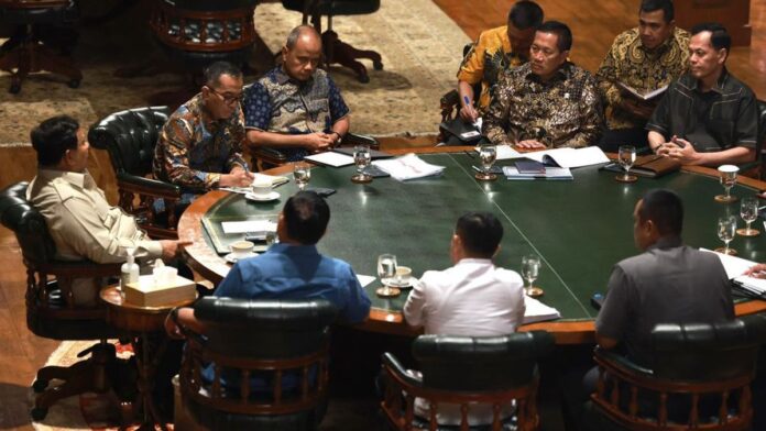 Presiden RI Prabowo Subianto menggelar sejumlah rapat terbatas bersama para menteri Kabinet Merah Putih di kediaman pribadinya di Hambalang, Bogor, Jawa Barat, Minggu (8/3/2026).