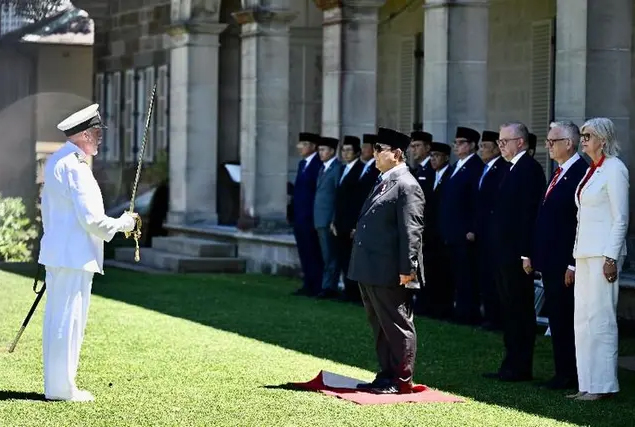 Presiden RI Prabowo Subianto disambut Gubernur Jenderal Australia Sam Mostyn dalam upacara kenegaraan di Admiralty House, Sydney, Rabu (12/11/2025).