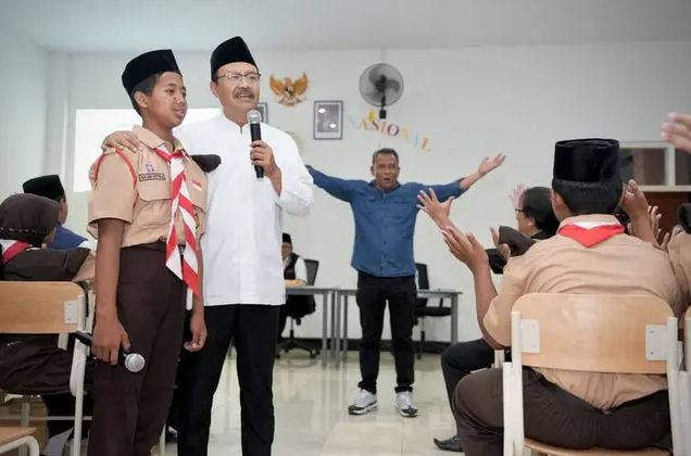 Penuh percaya diri, Amanda melafalkan untaian kata dalam Bahasa Inggris. Gus Ipul menjelaskan kepercayaan diri dan kedisiplinan siswa adalah buah dari kesabaran para guru dan tenaga kependidikan dalam membimbing siswa.