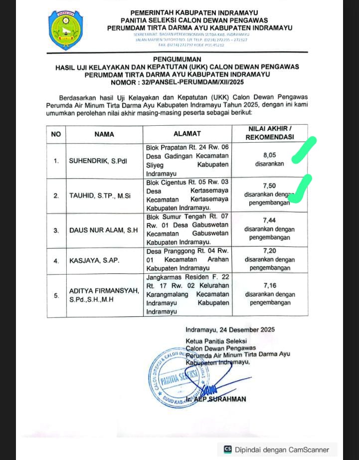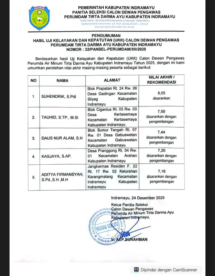 Sikapnya itu tercetus atas pelantikan 3 orang Dewas pada Rabu (21/1/2026) di Pendopo Kabupaten oleh Bupati Indramayu Lucky Hakim. Mereka bertiga yang dilantik adalah: 1. Asep Abdul Mukti, status ASN aktif jabatannya Kepala di Asda 2, dan merangkap mantan Kadis plus Plt di PUPR. 2. Suhenderik, S.PdI, M.Pd alamat Blok Prapatan RT 24 RW 06 Desa Gadingan Kecamatan Sliyeg Kabupaten Indramayu. Dengan nilai akhir seleksi 8,05 dan rekomendasi disarankan. 3. Tauhid STP, M.Si alamat Blok Cigentus RT 05 RW 03 Desa Kertasemaya Kecamatan Kertasemaya Kabupaten Indramayu. Dengan nilai akhir seleksi 7,50 dan rekomendasi disarankan dengan pengembangan.