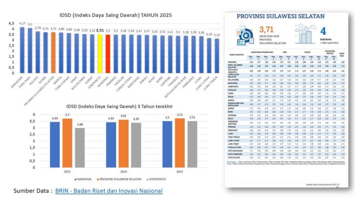 Berdasarkan rilis resmi Badan Riset dan Inovasi Nasional (BRIN), Provinsi Sulawesi Selatan mencatat skor 3,71 pada Indeks Daya Saing Daerah (IDSD) Tahun 2025. Capaian tersebut berada di atas rata-rata nasional tahun 2025 yang sebesar 3,50.