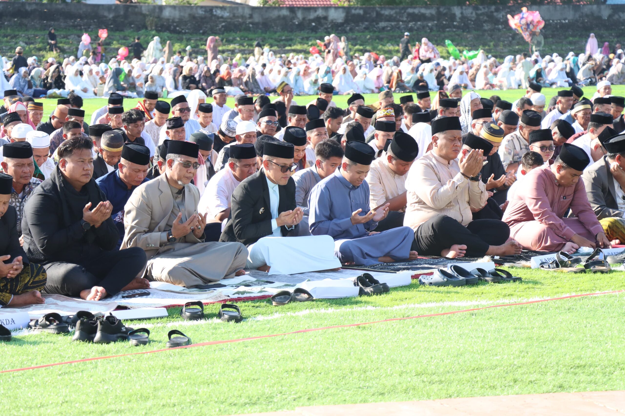 Sejak pagi hari, masyarakat telah memadati area stadion untuk menunaikan salat Idulfitri. Momentum ini menjadi ajang silaturahmi antara pemerintah daerah dan masyarakat setelah sebulan penuh menjalankan ibadah puasa Ramadan.
