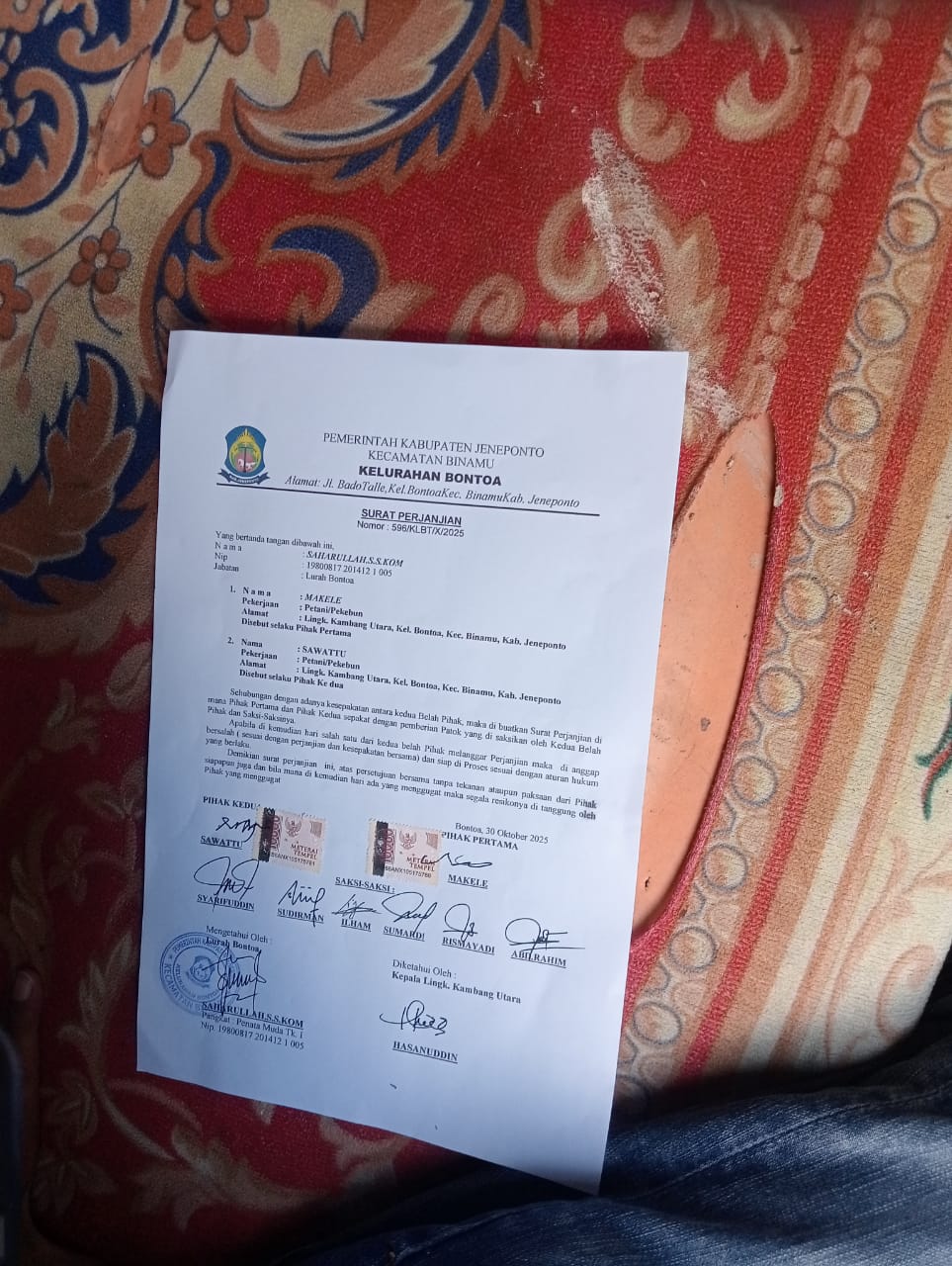 Kepala Kelurahan Bontoa berhasil memediasi kedua belah pihak terkait dengan perkara perselisihan batas patok tanah yang masing-masing diklaim oleh pemiliknya, Kamis (30/10/2025).