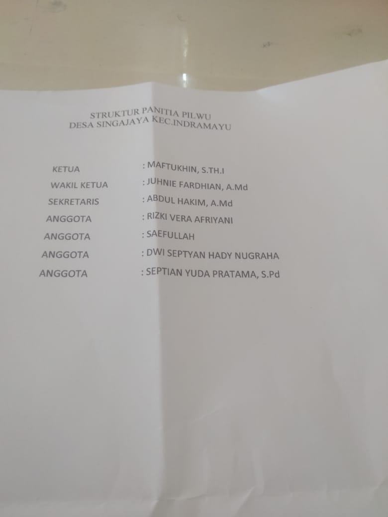 Sementara terkait struktur kerja Panitia Pilwu Desa Singajaya tercatat sebagai berikut: Ketua: Maftukhin, Wakil Ketua: Juhnie Fardhian, A.Md, Sekretaris: Abdul Hakim, A.Md, Anggota: Rizki Vera Afriyani, Saefullah, Dwi Septyan Hadi Nugraha, dan Septian Yuda Pratama, S.Pd.
