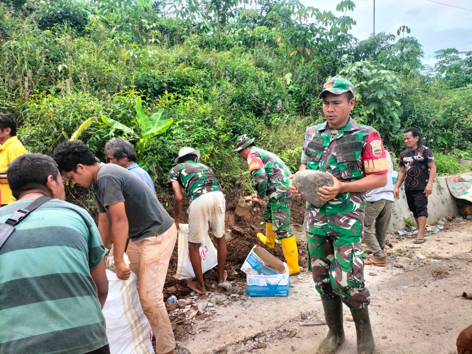 Pantauan wartawan di lapangan, ada tiga personel dari TNI dari Ramil Pinangsori ikut bergotong royong bersama masyarakat setempat, dan masyarakat mengapresiasi kedatangan TNI dimaksud