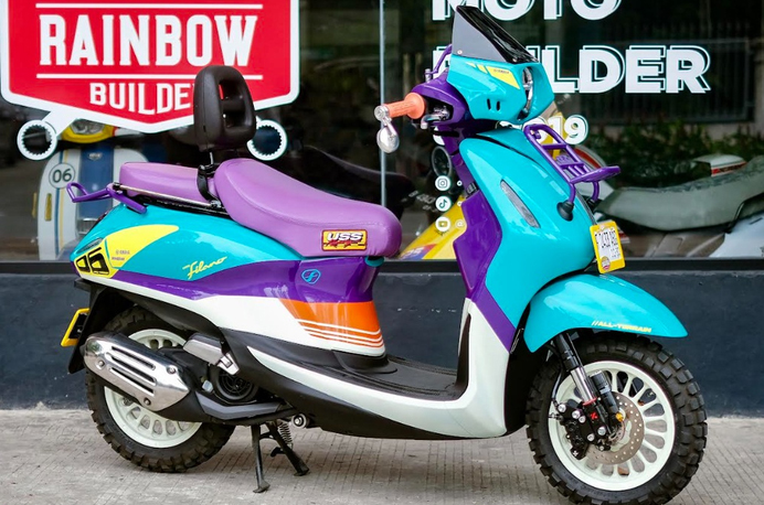Bagian depan skutik ini tampil berbeda berkat penggunaan custom retro headcover bergaya rally 80-an dengan bentuk lebih tegas dan dilengkapi mini visor smoke. Perpaduan warna tosca dan ungu pada area batok lampu memperkuat karakter Urban Rally yang bold, sekaligus tetap menyatu dengan desain retro modern Grand Filano Hybrid dengan keberadaan front rack berwarna ungu yang terpasang dengan rapi.