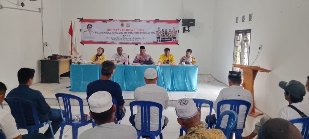 Badan Permusyawaratan Desa (BPD) Sungai Toman memberikan penilaian tentang kinerja kepala desa dan aparatus desa dalam musyawarah desa (musdes) khusus di Aula Kantor Desa Sungai Toman, Kecamatan Mendahara Ulu, Kabupaten Tanjung Jabung Timur, Rabu (7/1/2026).