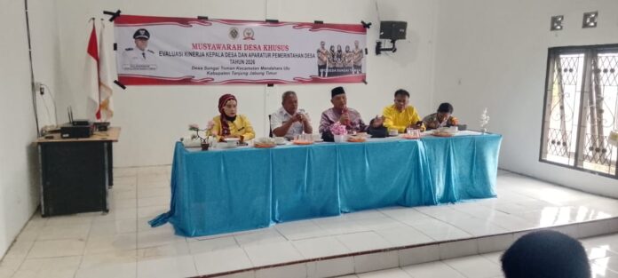 Badan Permusyawaratan Desa (BPD) Sungai Toman memberikan penilaian tentang kinerja kepala desa dan aparatus desa dalam musyawarah desa (musdes) khusus di Aula Kantor Desa Sungai Toman, Kecamatan Mendahara Ulu, Kabupaten Tanjung Jabung Timur, Rabu (7/1/2026).