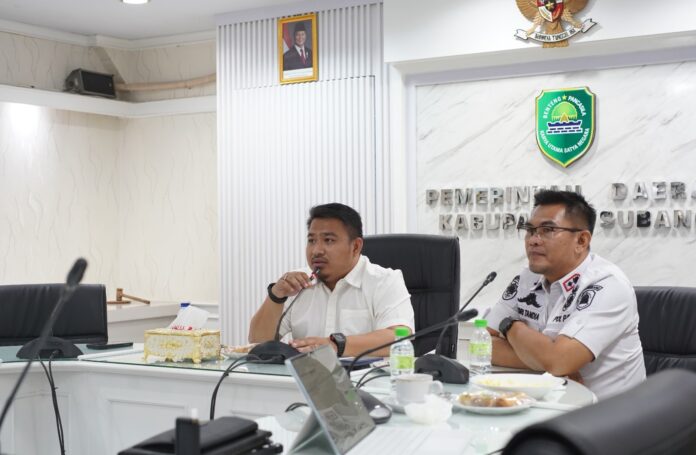 Bupati Subang Reynaldy Putra Andita mengikuti Rapat Koordinasi bersama Kementerian Pekerjaan Umum Republik Indonesia (PU RI) melalui Zoom Meeting, membahas permohonan izin pemanfaatan ruang milik jalan tol (Rumija Tol) untuk pembangunan simpang susun di ruas Tol Cikampek-Palimanan (Cipali) KM 115+800, berlangsung di Ruang Rapat Bupati -1, Kantor Bupati Subang, pada Rabu (15/10/2025).