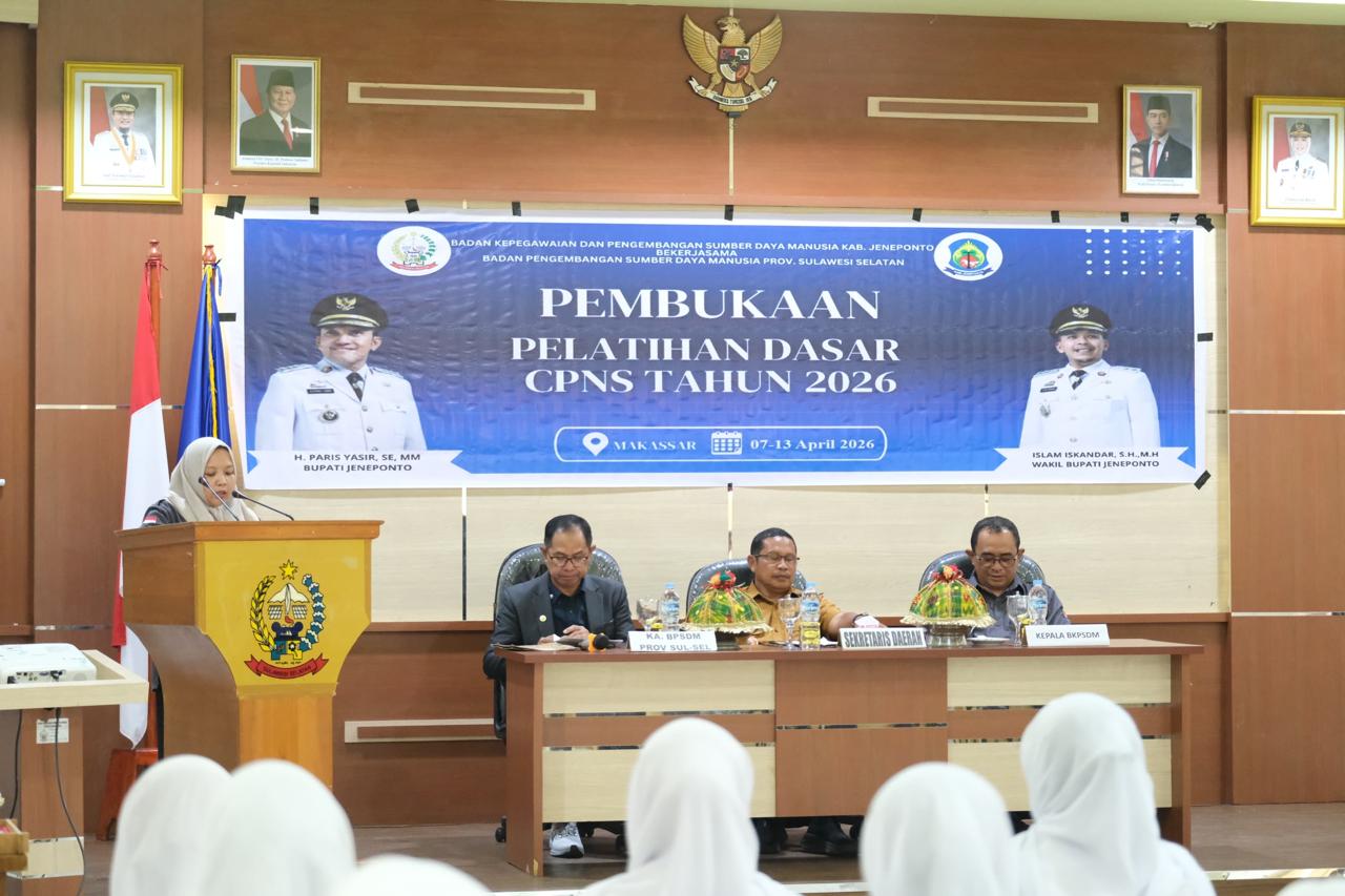 Pemerintah Kabupaten Jeneponto resmi membuka Pelatihan Dasar (Latsar) Calon Pegawai Negeri Sipil (CPNS) Angkatan XII Tahun 2026. Kegiatan ini dibuka langsung oleh Penjabat Sekretaris Daerah (Pj Sekda) Kabupaten Jeneponto, Maskur, S.Ag., M.H., CGCAE, pada Selasa, 7 April 2026.