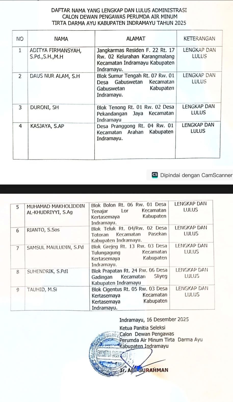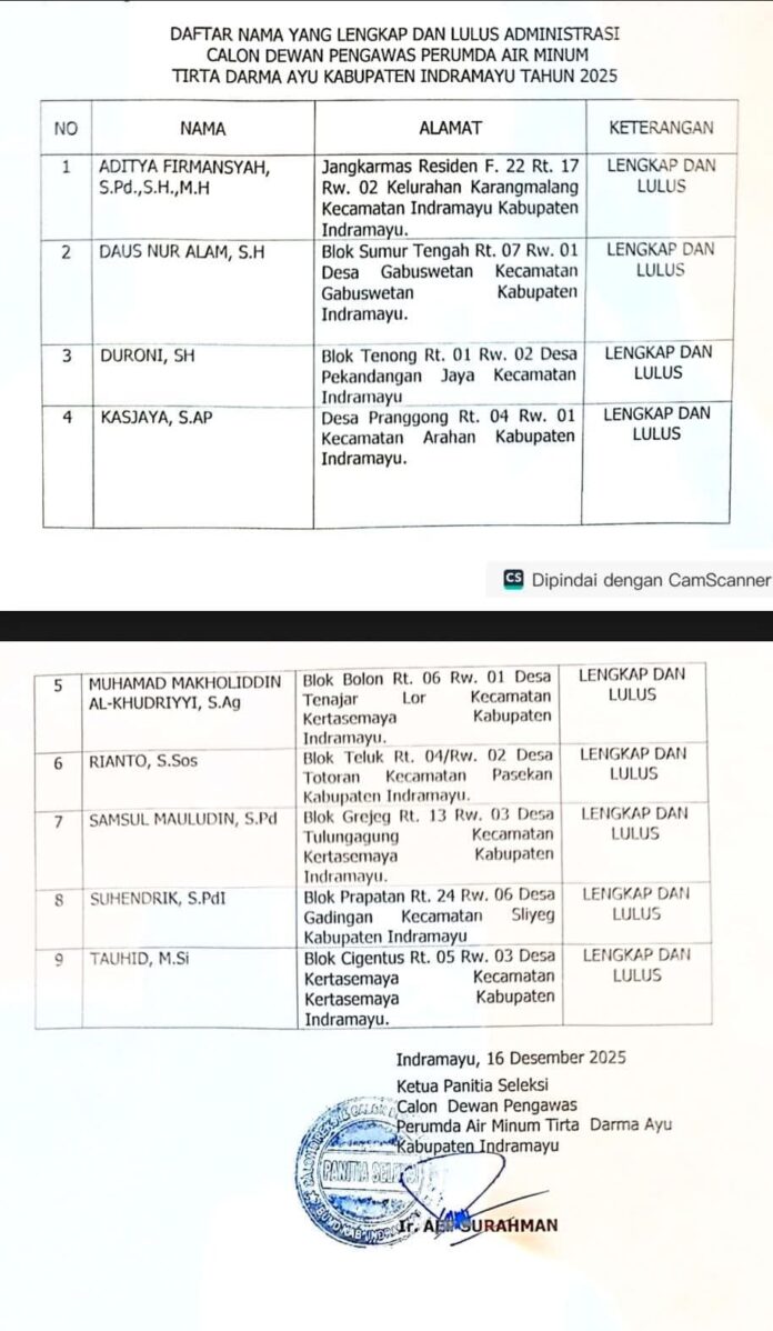 Demikian daftar nama yang lengkap dan lulus administrasi calon Dewan Pengawas Perusahaan Umum Daerah Air Minum Tirta Darma Ayu Kabupaten Indramayu Tahun 2025, pada 16 Desember 2025, yang di tanda tangani oleh Ketua Panitia seleksi Ir Aep Surahman, selaku pejabat Sekretaris Daerah Kabupaten Indramayu. (S. Tarigan)