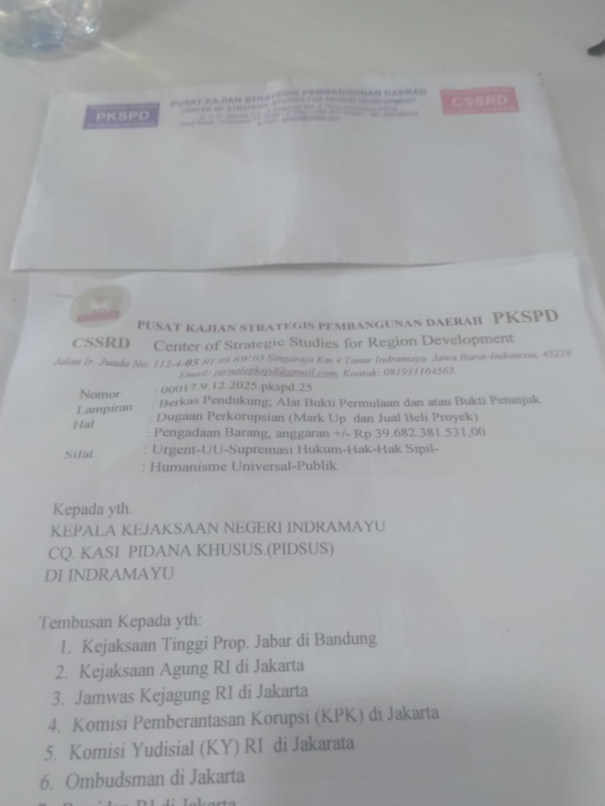 Surat bernomor 000.17.9.12.2025.pkspd25 tersebut ditujukan ke Kepala Kejaksaan Indramayu melalui Kasi Pidana Khusus (Kasi Pidsus) dengan tembusan kepada Kejaksaan Tinggi Jabar di Bandung, Kejaksaan Agung RI, Jamwas Kejagung RI, KPK RI, Komisi Yudisial RI, Ombudsman RI, dan Presiden RI.