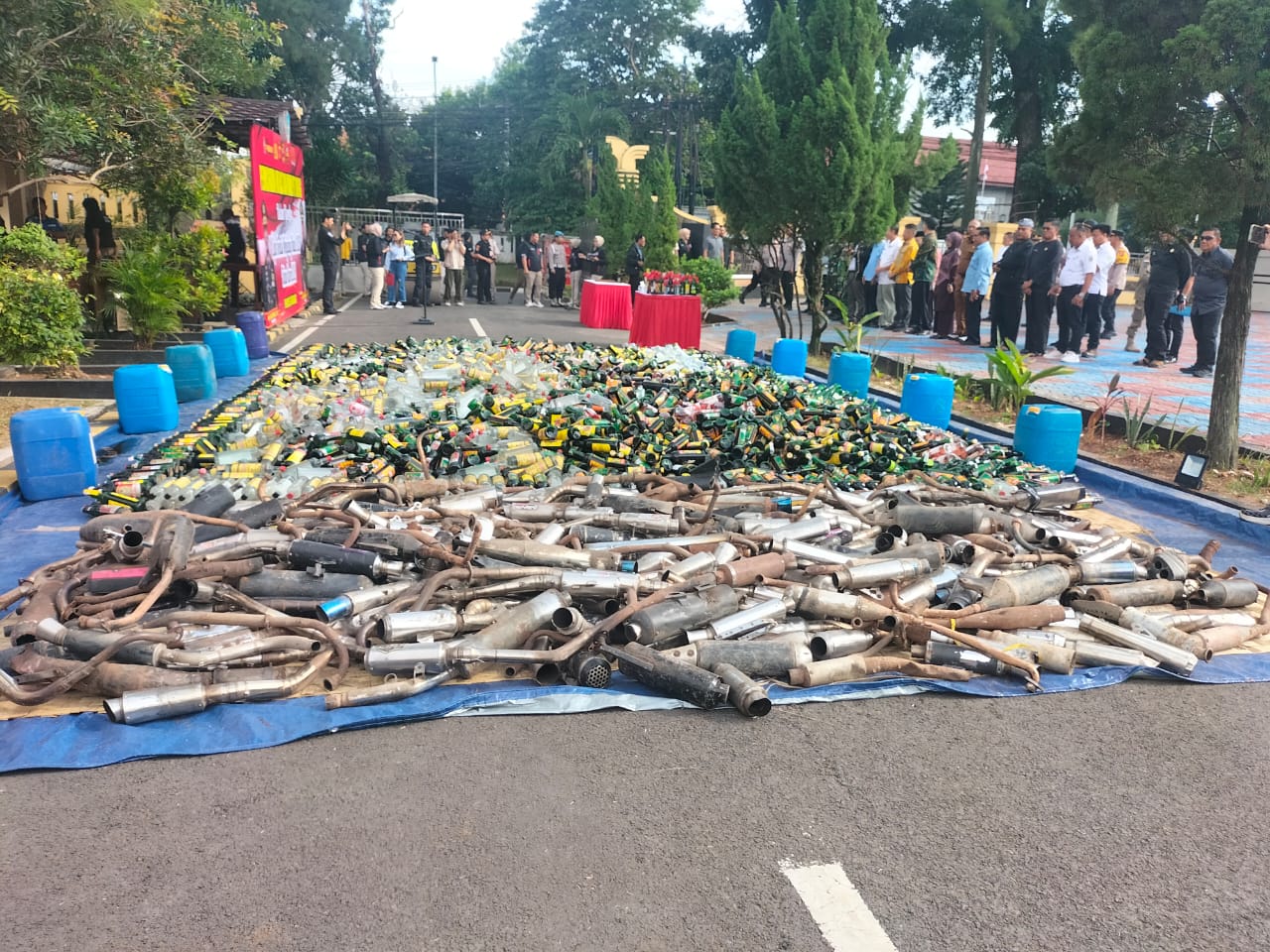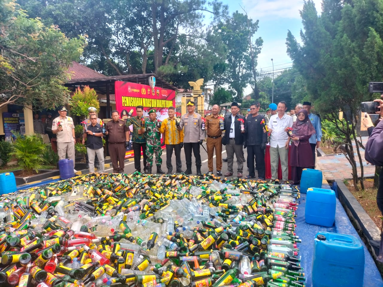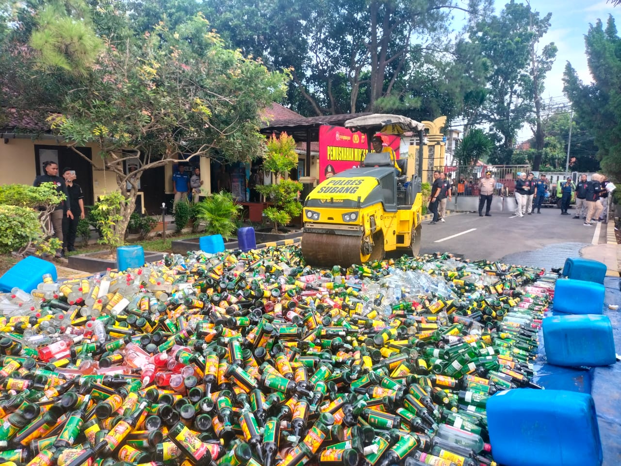 Sebanyak 16 ribu botol miras berbagai merk dan 520 knalpot brong yang tidak sesuai spesifikasi teknis yang merupakan barang bukti, dimusnahkan Polres Subang di depan Kantor Propam Polres Subang, Kamis (18/12/2025).