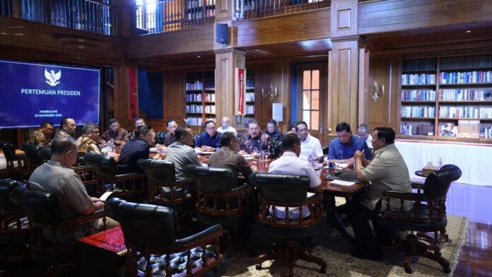 Presiden Republik Indonesia Prabowo Subianto melakukan rapat terbatas pertemuan bersama sejumlah anggota Kabinet Merah Putih membahas sejumlah isu strategis terkait pembahasan penertiban dan penegakan hukum di sektor hutan hingga tambang di Padepokan Garuda Yaksa, Hambalang, Bogor, Jawa Barat, Minggu (23/11/2025).