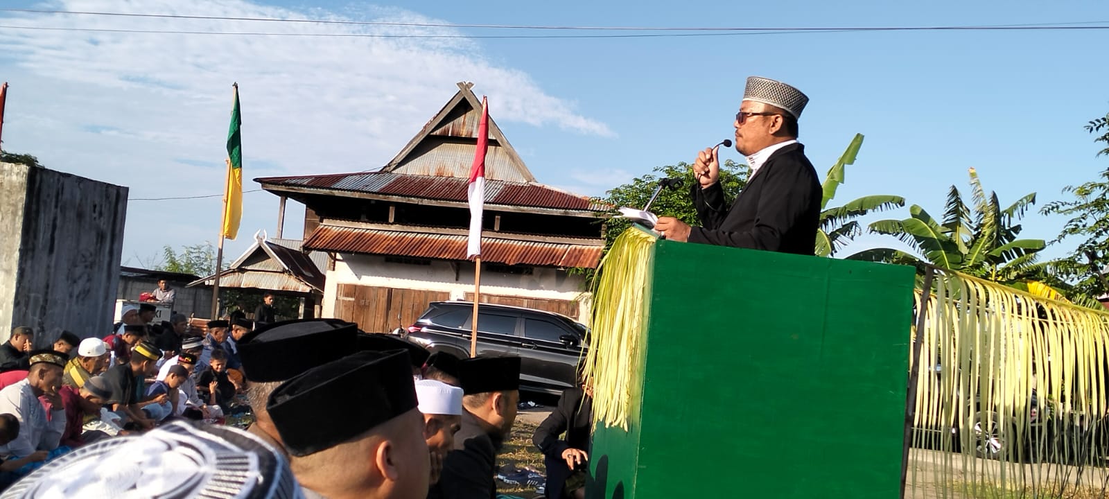 Kepala Kelurahan Bontoa membacakan sambutan seragam Bupati Kabupaten Jeneponto pada Shalat Id 1447 hijriah tahun 2026 dengan memaparkan program-program kerja yang berhasil direalisasikan.