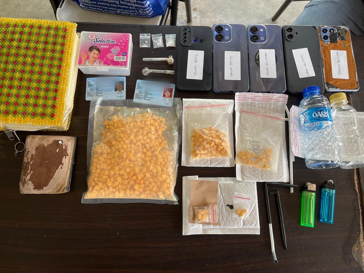 Dari hasil penggeledahan, petugas menemukan barang bukti berupa 1.013 butir pil ekstasi seberat 343 gram, tiga paket sabu seberat 1,27 gram, alat hisap, beberapa unit handphone, serta buku catatan yang diduga terkait transaksi narkotika.