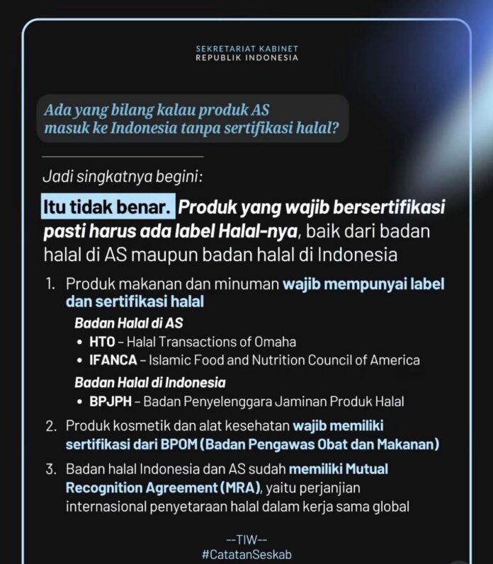 Sekretaris Kabinet (Seskab) Teddy Indra Wijaya menegaskan informasi yang menyebut produk Amerika Serikat (AS) dapat masuk ke Indonesia tanpa sertifikasi halal adalah tidak benar.