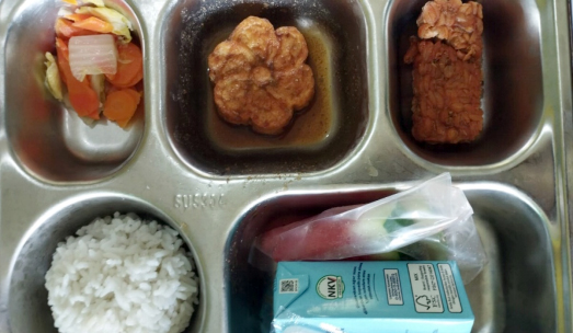 Dalam paket Makanan Bergizi Gratis (MBG) yang diterima siswa, porsi nasi terlihat sangat sedikit. Lauk pauk pun minim, hanya satu potong tempe, satu butir telur yang dicetak bulat, serta irisan wortel dan engkol berjumlah sekitar tujuh potong kecil, buah semangka yang disajikan juga diiris tipis dan susu kotak satu buah.