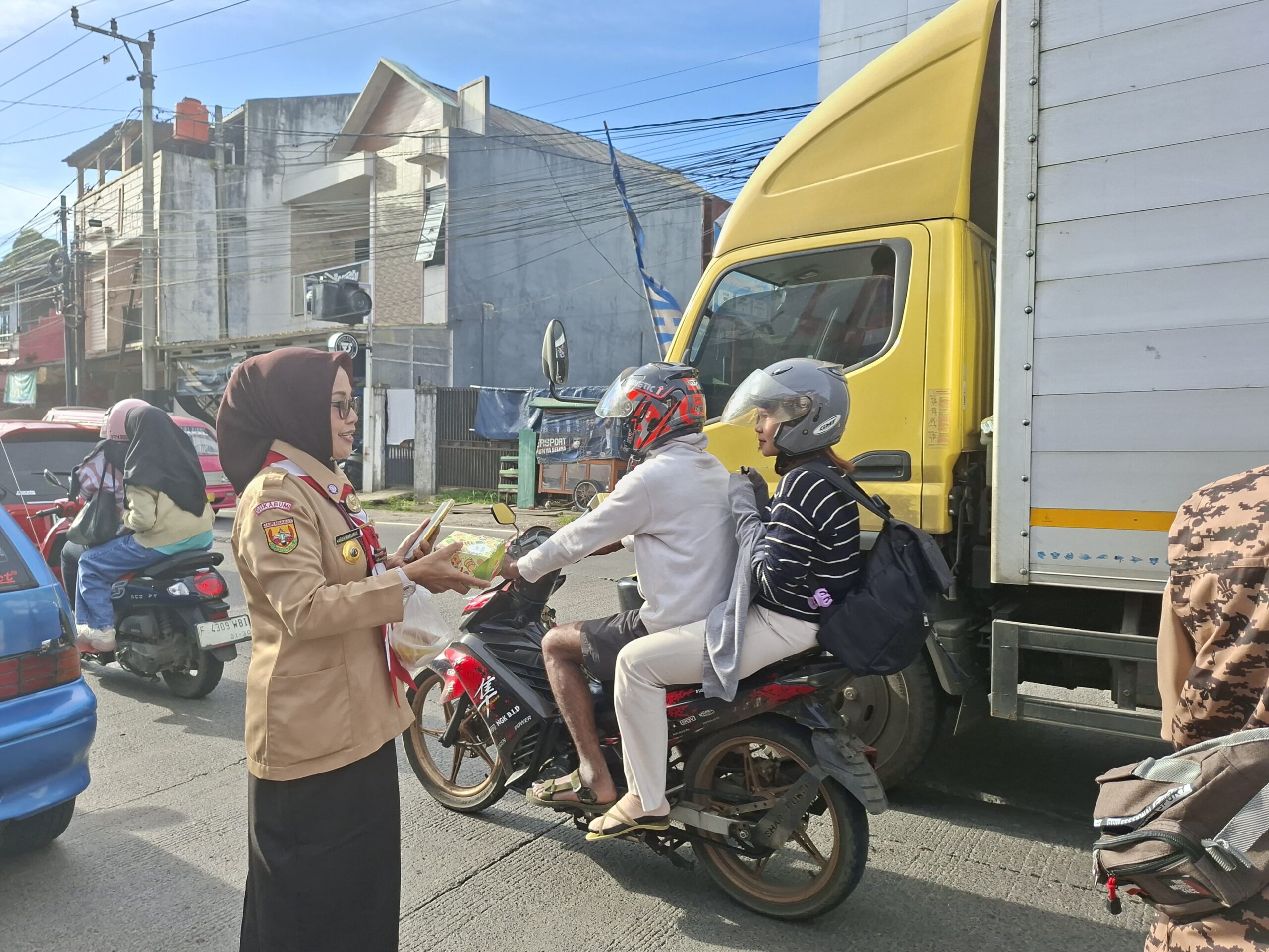 Dengan senyum ramah, para pahlawan tanpa tanda jasa ini turun langsung ke jalan untuk membagikan paket makanan dan minuman pembatal puasa.