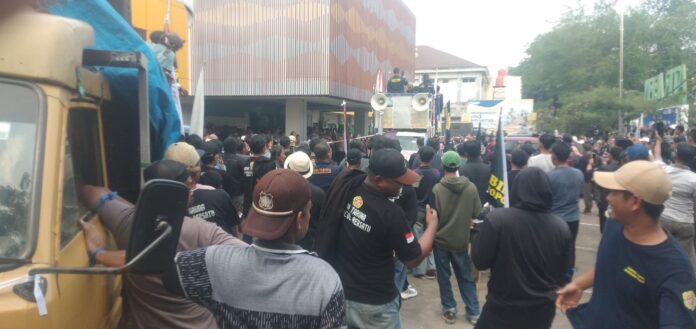 Ribuan pengunjuk rasa masyarakat Poponcol Karawang Kulon menyerbu Kantor Pertanahan Karawang untuk menuntut agar pihak BPN mengeluarkan dari plotting pengembang perumahan, Kamis (11/12/2025).