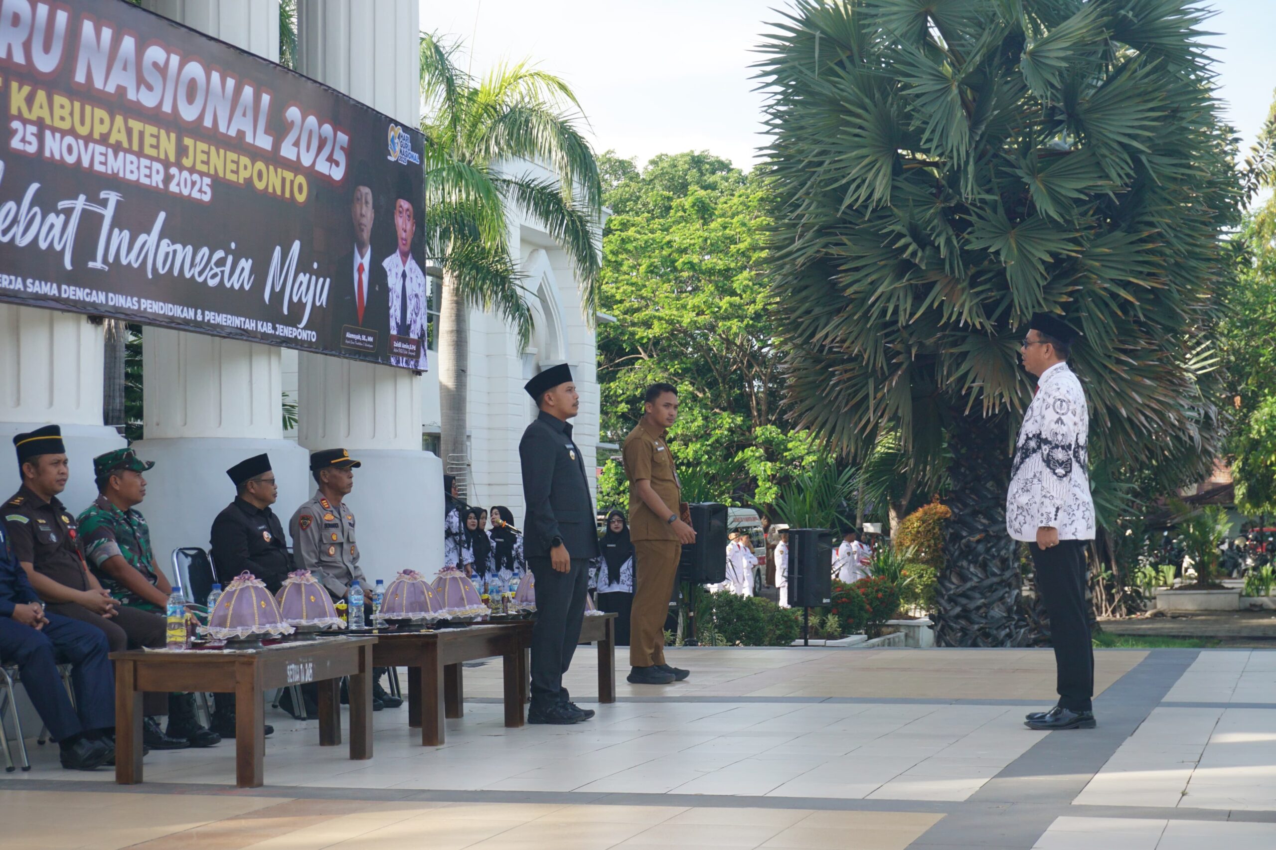 Pemerintah Kabupaten Jeneponto menggelar upacara peringatan Hari Guru Nasional (HGN) 2025 di halaman Kantor Bupati Jeneponto pada Selasa, 25 November 2025. Mengusung tema nasional “Guru Hebat, Indonesia Maju,” kegiatan ini berlangsung khidmat dan dihadiri ratusan peserta yang terdiri atas para guru, tenaga kependidikan, serta jajaran pemerintah daerah.