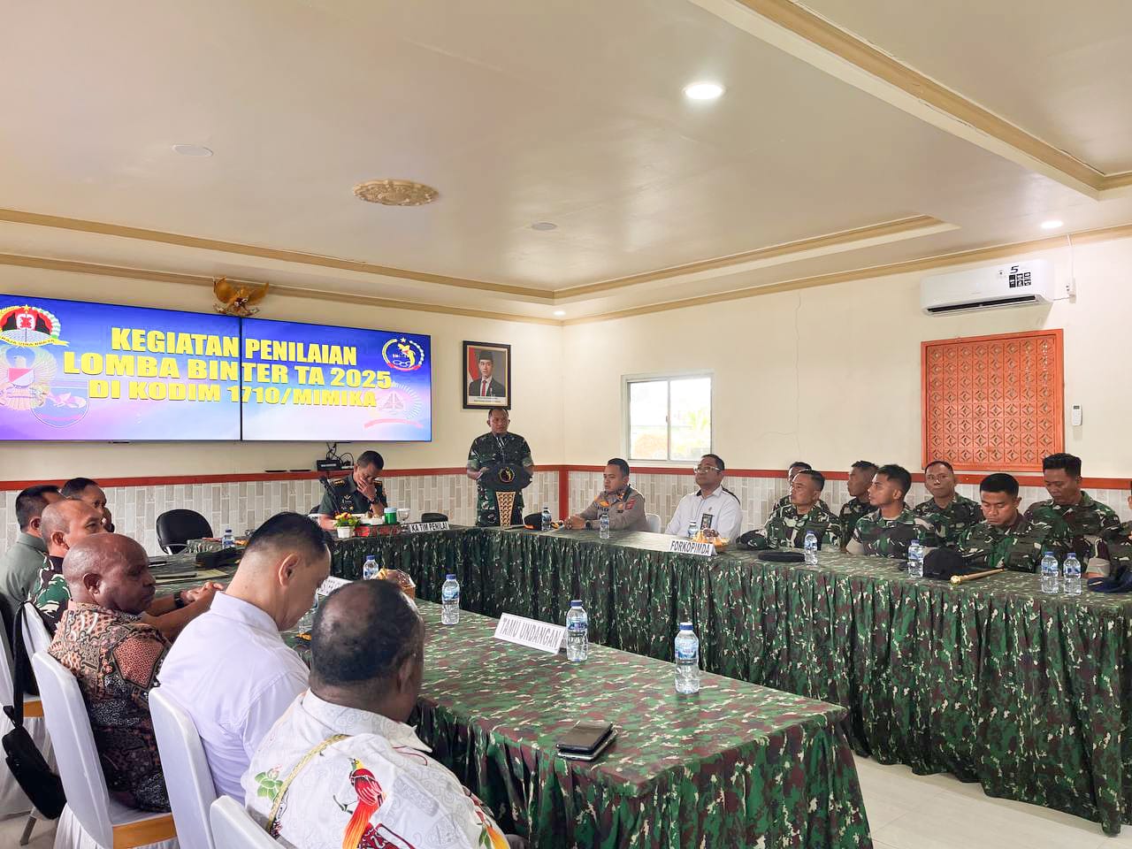 Kodim 1710/Mimika, menerima kunjungan kerja Tim Penilaian Lomba Pembinaan Teritorial (Binter) Tahun Anggaran 2025 yang dipimpin oleh Kolonel Inf Suhartono, S.I.P., Kegiatan berlangsung pada Senin (8/9/2025) di Makodim 1710/Mimika, jalan Agimuga Mile 32, Kab. Mimika. Lomba Binter merupakan agenda tahunan TNI Angkatan Darat yang melibatkan seluruh Kodam untuk menilai dan memilih satuan Kodim terbaik sebagai perwakilan di tingkat nasional.